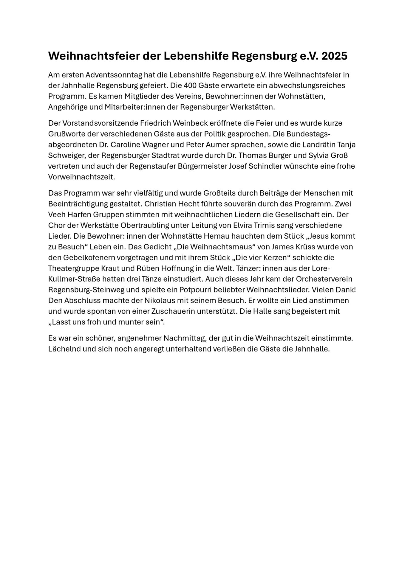 Am 30.11. fand wieder die gemeinsame Weihnachtsfeier der Lebenshilfe statt, diesmal in der Jahnhalle Regenstauf. Anbei finden Sie unseren Bericht und einige Impressionen!